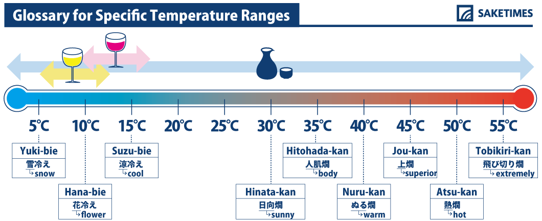 Kan (燗) - Hot/warmed (see picture of serving temperatures above) sake